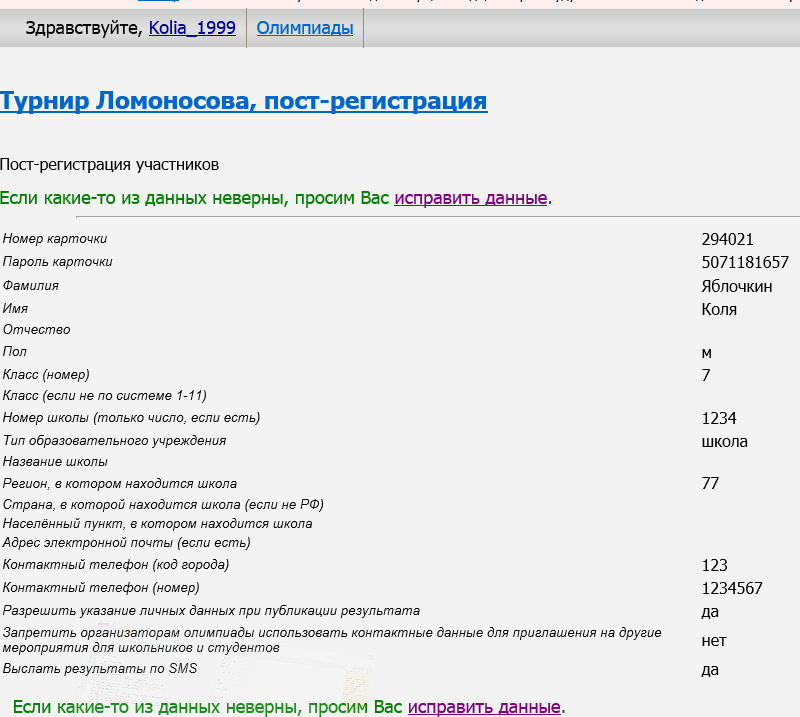 Советуем вам не забывать номер карточки, потому что если вы не указали "Разрешить указание личных данных при публикации результата", то все результаты на сайте будут публиковаться именно по номеру карточки.
